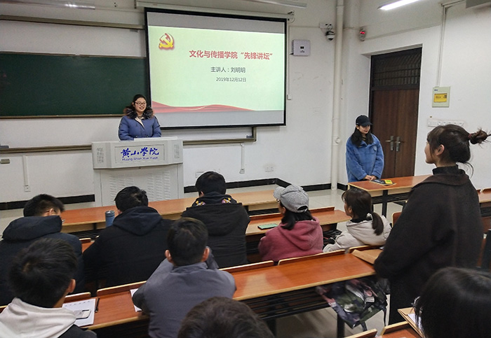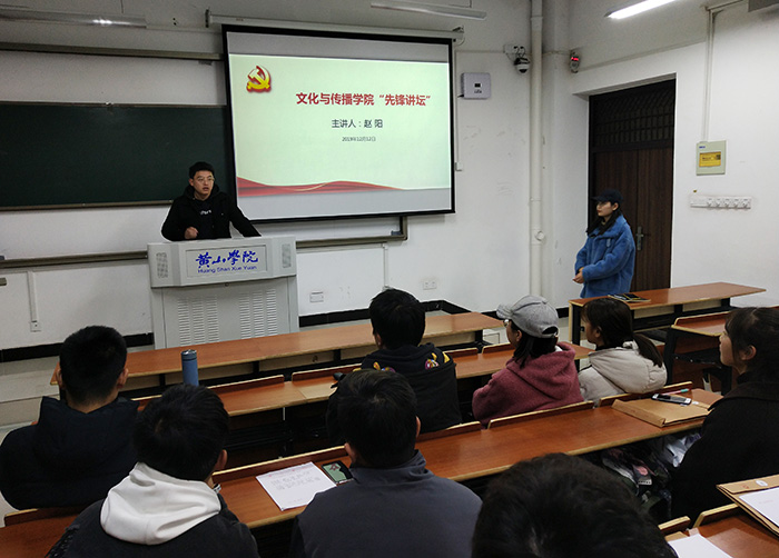 12月12日晚,我院在文渊楼1202教室举办“先锋讲坛”系列讲座。本次讲座由学生党员、16级戏剧影视文学专业的国家奖学金获得者刘明明同学和16级播音与主持艺术专业《星火》话剧省级一等奖获得者赵阳同学分别担任主讲人。我院学生支部党员和入党积极分子参加讲座。