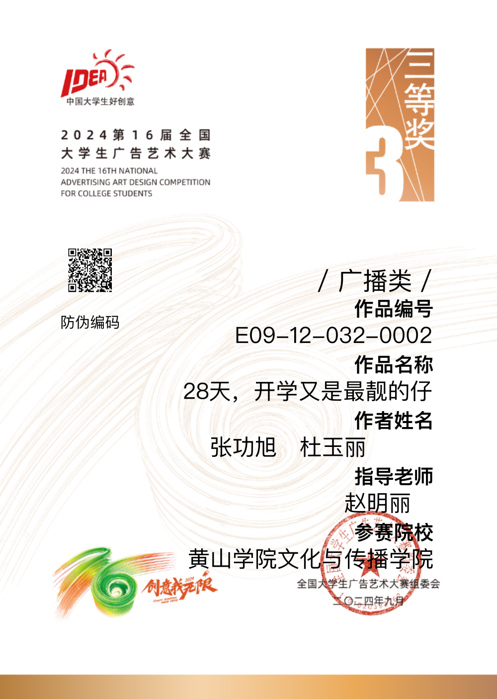 近日,第十六届全国大学生广告艺术大赛全国总决赛结果揭晓,由张功旭、万科含创作,方婷婷、贾兰雨指导的《超能守护 运动无忧》,张功旭、杜玉丽创作,赵明丽指导的《28天,开学又是最靓的仔》获得广播类作品全国三等奖。在省赛中,太阳成集团tyc9728学子创作的作品获省一等奖4件、省二等奖5件,省三等奖11件。