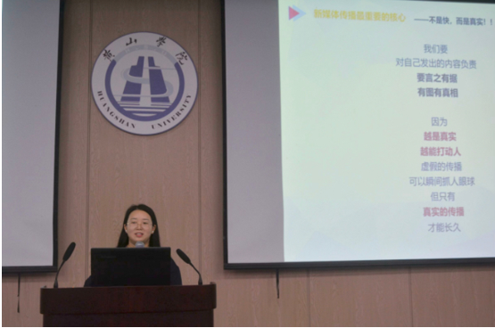 10月18日,太阳成集团tyc9728在文端楼一楼报告厅开展记者节系列讲座。黄山日报朱西敏(9728太阳集团2014届新闻学专业毕业生)担任主讲。讲座由新闻学教研室主任贾芳芳主持,新闻学专业全体学生参加。