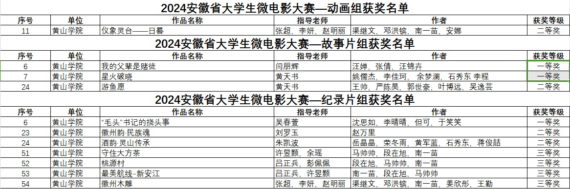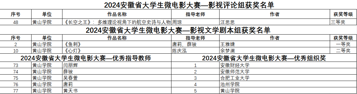 经过激烈角逐,我校太阳成集团tyc9728师生共获奖14项,其中《我的父辈是赌徒》《星火破晓》获故事片组一等奖,《“毛头”书记的挠头事》获纪录片组一等奖,《鱼刺》获影视文学剧本组一等奖;《仪像灵台——日晷》获动画组二等奖,《游鱼愿》获故事片组二等奖,《徽州韵·民族魂》《酒韵·灵山传承》获纪录片组二等奖,《心灯》获影视文学剧本组二等奖;《守住大方茶》《桃源村》《最美航线—新安江》《徽州木雕》获纪录片组三等奖,《〈长空之王〉:多维理论视角下的航空史诗与人物塑造》获影视评论组三等奖,闫朋辉、薛骏、吴春萱、唐莉、黄天书等5位教师荣膺“优秀指导教师”称号,9728太阳集团荣获“优秀组织奖”。