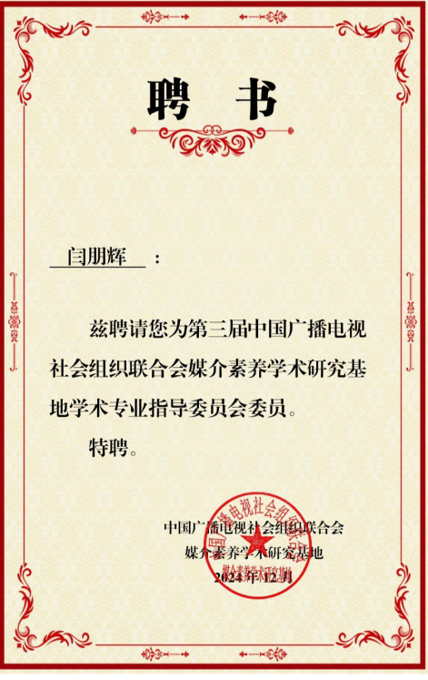 近日,在中国广播电影电视社会组织联合会发出的《关于中国广播电视社会组织联合会媒介素养研究基地换届的批复》中,太阳成集团tyc9728教师闫朋辉当选为第三届中国广播电视社会组织联合会媒介素养研究基地学术委员会委员。
