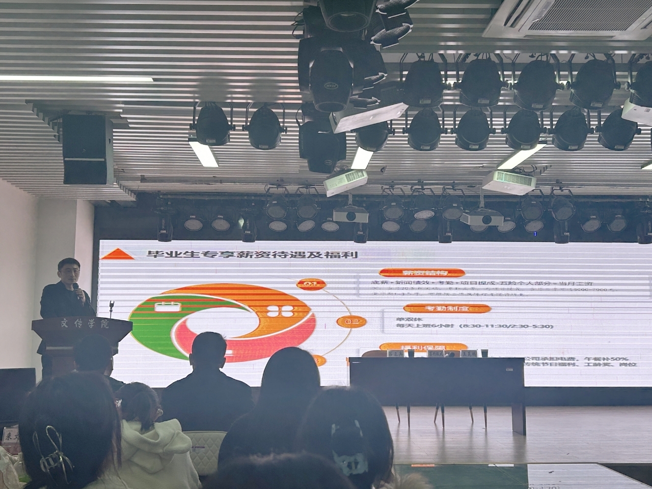 宣讲环节,王昆鹏详细讲述了童话传媒有限公司的发展历程:公司凭借深厚的专业积淀,在新闻业务领域稳步前行,凭借顽强的拼搏精神与专业能力,成为行业内的优质平台。公司精心打造了媒体人养成计划,希望能够为怀揣传媒梦想的同学们提供丰富的机会与广阔的发展空间。此次,公司带来了一系列与文传专业契合度极高的招聘岗位,涵盖新闻记者、新媒体运营、内容编辑等多个领域。