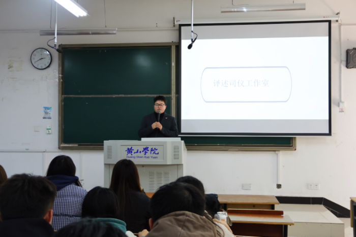 团队主理人、2017级播音与主持专业谭祖飞率先上台,深情回顾了自己的大学时光。他详细讲述了在校期间积极参与各类播音主持比赛,不断锤炼专业技能的经历,分享了从大三开始投身创立译述•追声工作室的历程与收获。谭祖飞深入阐释了团队的文化内涵、核心理念以及宣传标语,并通过播放工作室宣传片,向同学们展示了译述•追声的独特魅力,诚挚邀请对播音与主持领域有热情的同学加入团队。
